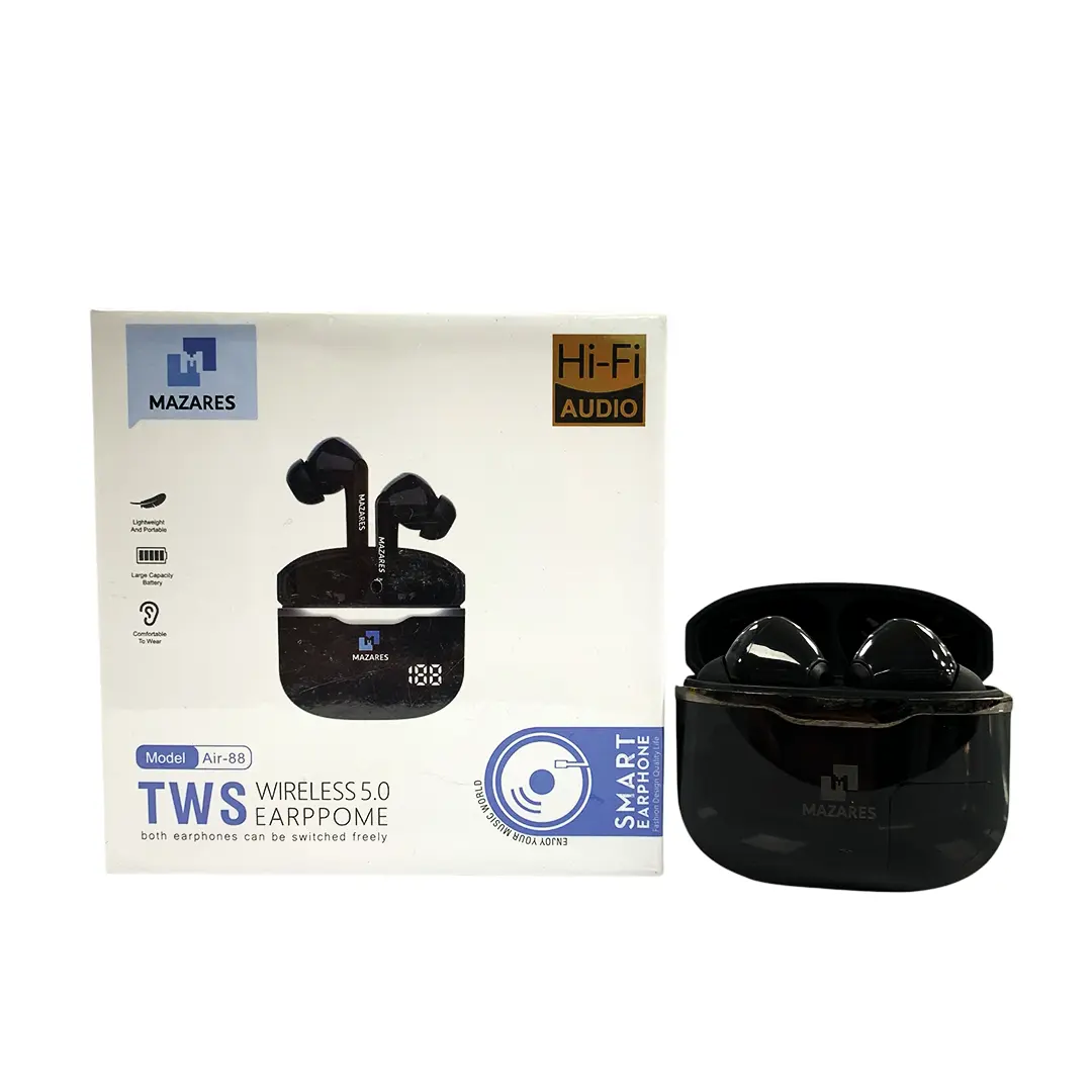 بیسیم، باهوش، همیشه آماده صدایی که باهات راه میاد و شارژش رو نشونت میده، ایرپاد بلوتوثی مازارس مدل Air-88 یه انتخاب اقتصادی و خوشساخت برای استفاده روزمرهست.
