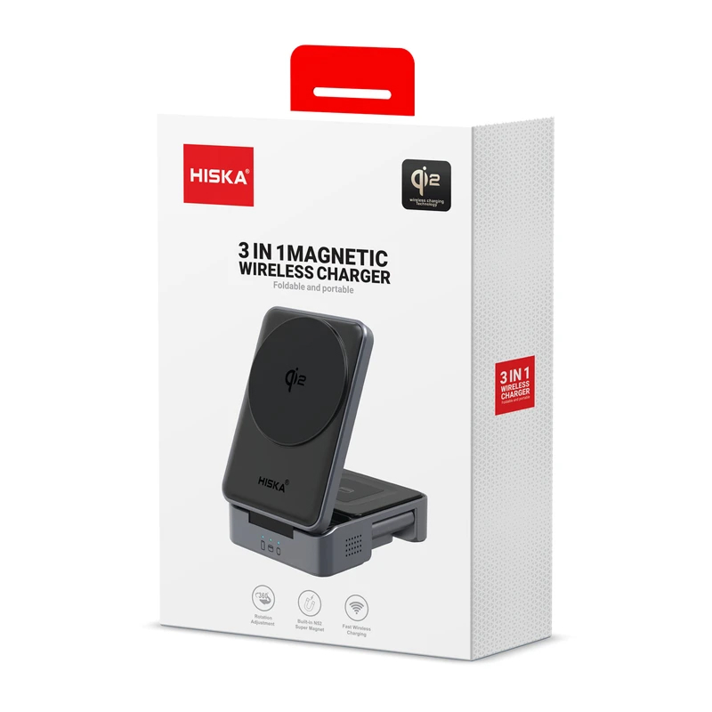 گوشی، اپل واچ، ایرپاد هر سه کنار هم، بدون سیم، بدون شلوغی. شارژر وایرلس سه کاره رومیزی هیسکا مدل HR-15 یه ایستگاه شارژ شیکه که میزت رو مرتب نگه میداره و دستگاههات رو همیشه آماده.